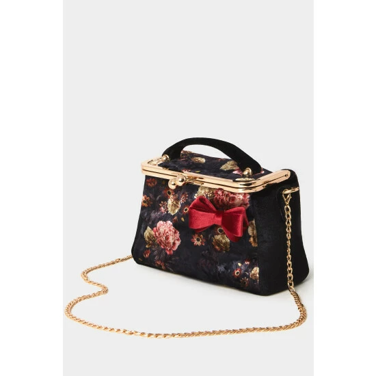 This velvet night bag is full of Joe Browns flair. From the gorgeous print to the opulent bow, and the vintage shape to the matching shoes, every inch was designed to show off what we do best. Complete with all the practical bits, including an internal pocket and chain strap, it’ll quickly become an essential accessory in your collection. 22 x 16 x 9cm. Handle 17cm. Strap 127cm.