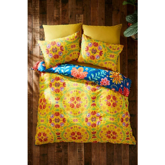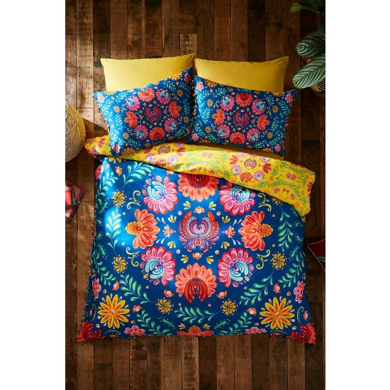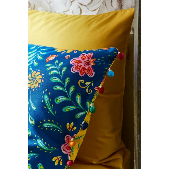 Fall asleep in funky florals with this fabulous reversible bed set. Bringing together a bold, folky design with a colourful, pom pom trim, it’s great for showing off your unique, playful style. Comfortable and crafted from cotton sateen fabric, it comes with a duvet cover and matching pillowcases so you can dress your bed with the full set.