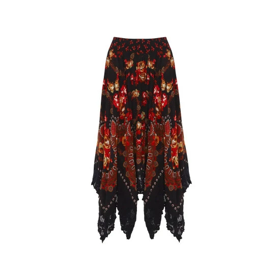 With lace trims, a rich print and handkerchief hem, this floaty skirt is all about the detail.Woven Fabric. Approx Length: 87cm.