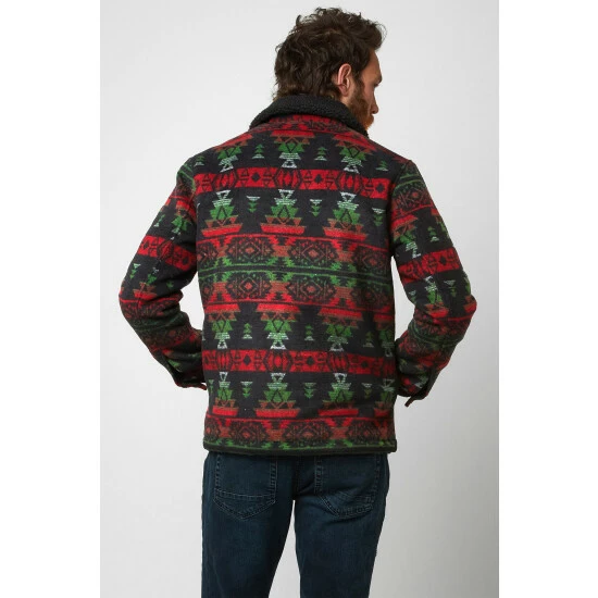 A warm wool blend jacket with a cosy borg lining and Ikat-inspired design.