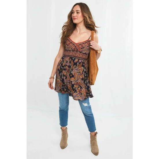 It’s the remarkable pattern and mesmerising colour palette that makes this longline camisole top so distinctive. We love how the gorgeous tones really pop against the black fabric – it helps to create such an eye-catching style. Oozing Boho vibes, it makes the perfect base for any unique look, whether you pair it with jeans and boots, or shorts and sandals.