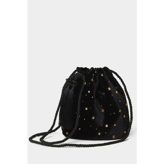 The perfect winter accessory, this black velvet handbag is simply stunning. In a pretty drawstring design, complete with printed gold stars and playful tassel ties, it’s a charming piece that’s bound to stand out in your collection. Why not pick up the matching boots to complete this elegant look? 22 x 18.5 x 12.5cm. Max Strap Length: 90cm.