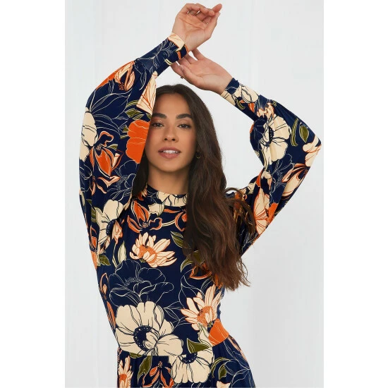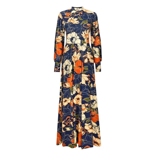 Bursting with boho vibes, we love this dress’ bold print, loose sleeves and stand up collar.Jersey Fabric. Approx Length: 135cm.