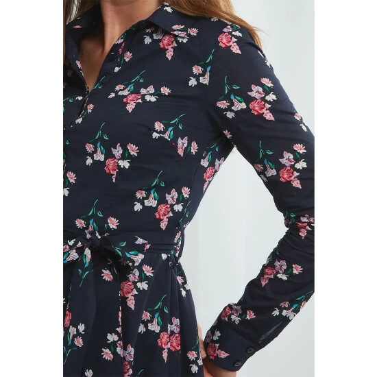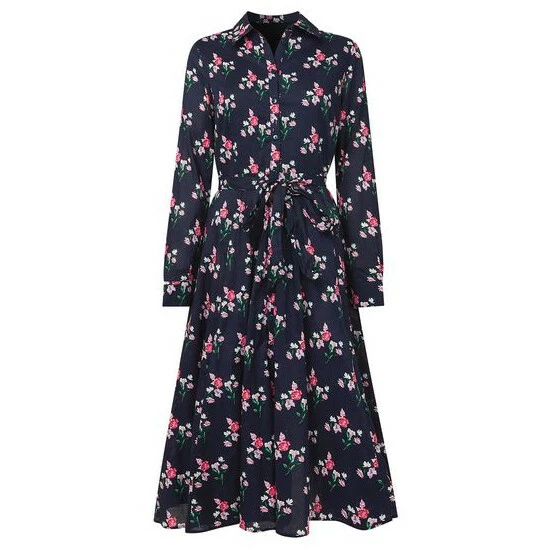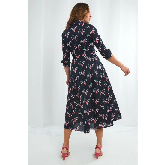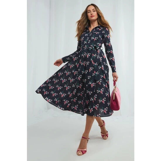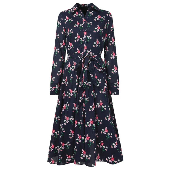 Inspired by stunning royal style, we created this beautiful button-through dress to help you feel just as regal. We love its sophisticated collar and full skirt, but we added a belt as well, to give it that gorgeous shape. Topped off with a lovely print that really stands out against the darker fabric, it’ll make a perfect addition to your seasonal wardrobe.