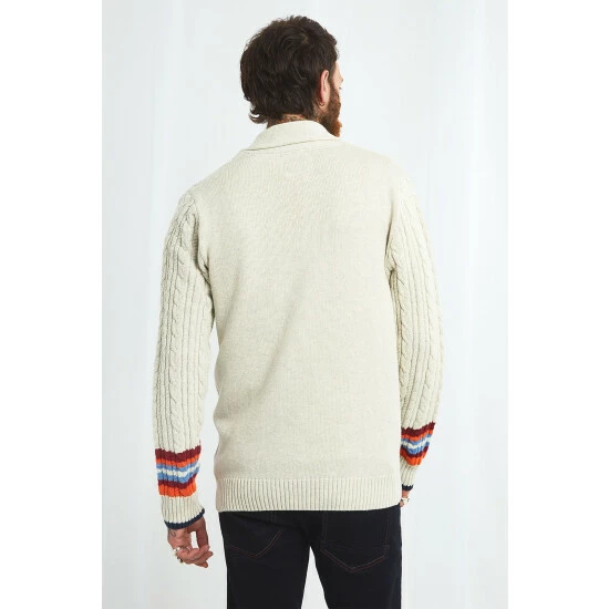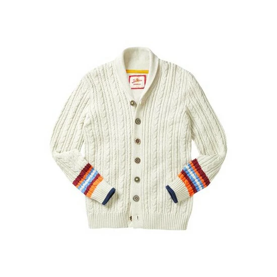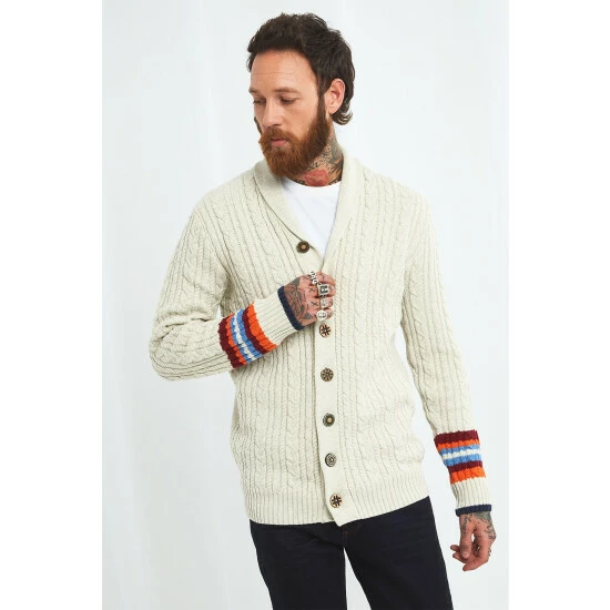 This cardigan is one of our favourite styles this summer. With mixed buttons and vibrant stripes at the cuffs, it brings a classic look bang up to date. Topped off with a cable knit on the body and a rib knit at the hem and shawl collar, it’s a design that’s sure to bowl you over.