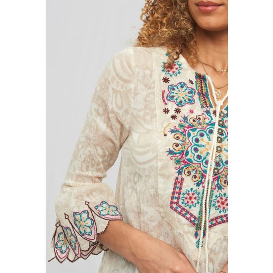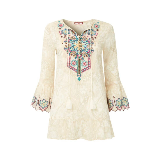 Choose this stunning tunic and you’ll add a totally remarkable piece to your seasonal wardrobe. We love the lightly printed design and gorgeous embroidery – so delicate and unique, it makes a real statement style. Topped off with flared sleeves and tassel ties, you’ll look so majestic while feeling incredibly floaty and free.
