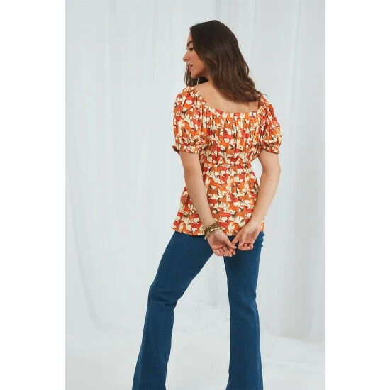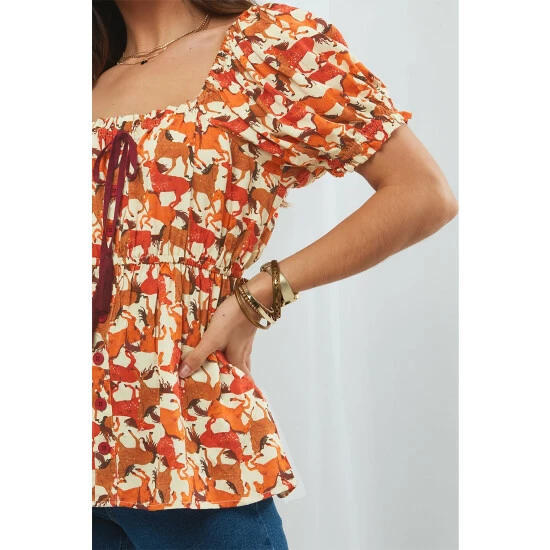 Enjoy a Western vibe in your springtime style with this beautiful boho top. Because it’s full of rich colours that make the bold print really stand out, it certainly gives off a distinctive feel. Topped with puff sleeves and a placket on the front, just add jeans for an easy wearing seasonal look that you’ll go wild for.