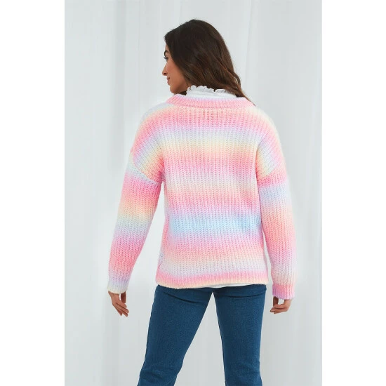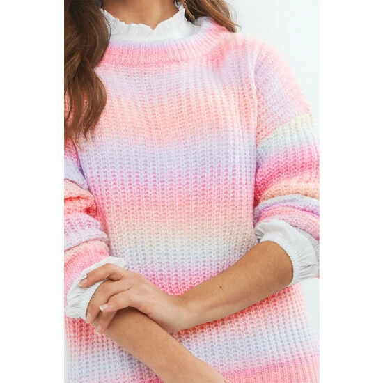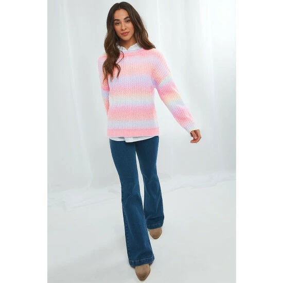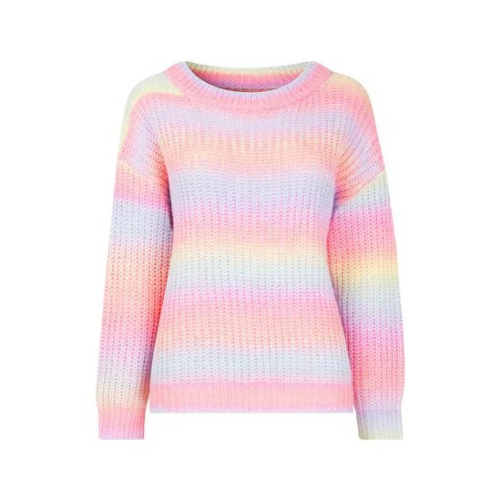Brighten up those cooler days with this ravishing rainbow sweater. Obviously it’s the array of multicoloured yarn that makes it a real showstopper, but with drop shoulder sleeves and a round neck, it creates a flattering fit that’ll help you feel confident and comfortable. Team it with your favourite jeans for a statement look this spring.