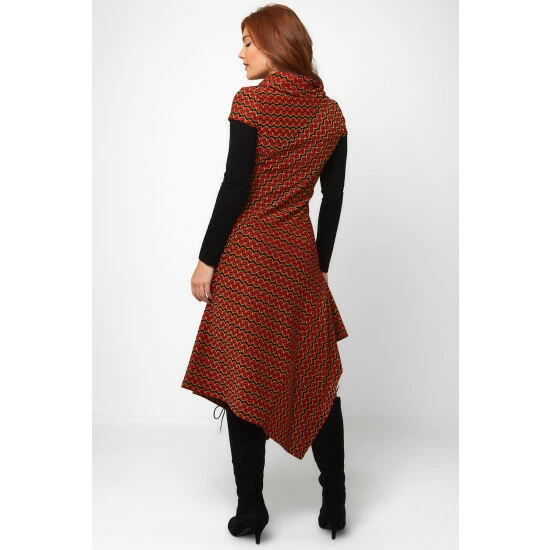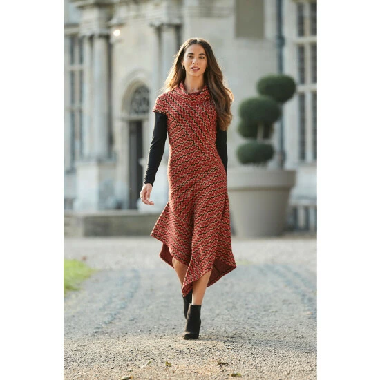 Easy-going dress with layered sleeve, a cosy cowl neck and an asymmetric hem.