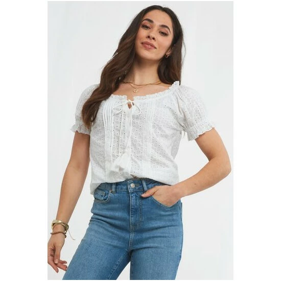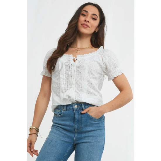 This beautiful blouse is a sure way to bring Boho flair to your summer style. From the broderie design to the tassel ties and frilled neckline, it’s bursting with gorgeous style details. The perfect partner for your favourite jeans, shorts or skirt, it’s so easy to wear – you’ll feel fabulous while showing off your unique style.
